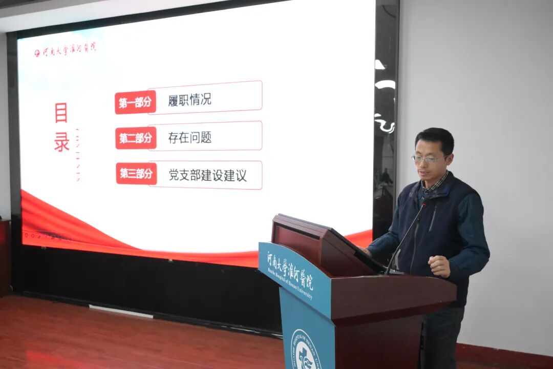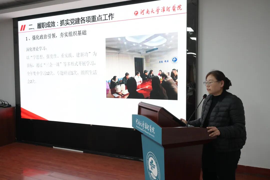 会上,机关党总支第五党支部纪检委员周金成、第六党支部组织委员贺瑞瑞,内科党总支第二党支部书记钟晓鸣、第十党支部书记李向垒,外科党总支第五党支部书记吴大铭、第十一党支部书记王艳丹,紧扣年度党建履职情况,实事求是总结成绩,深入剖析存在问题,依次进行现场述职,其他党支部书记进行书面述职。