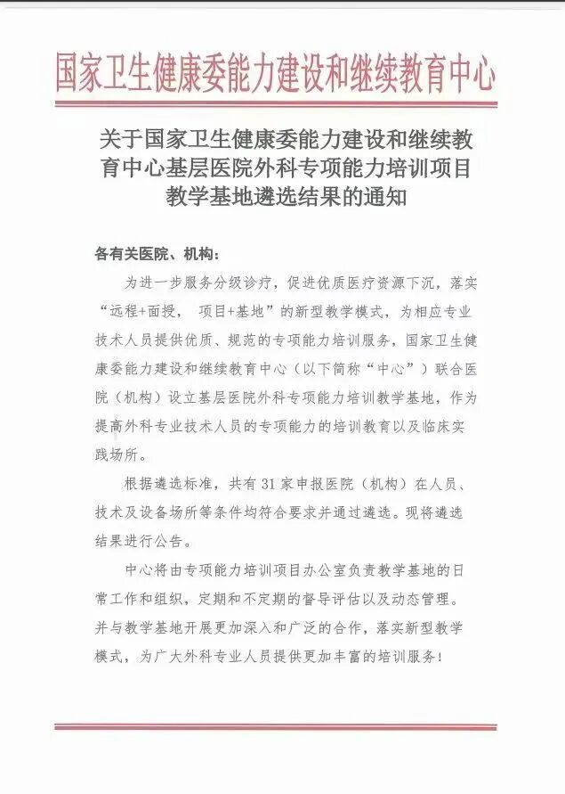 医院腔镜培训基地成立近15年,于2013年通过国家卫健委审核成为国家卫健委内镜培训基地,2020年腹腔镜培训基地经中国医师协会审核批准为中国医师协会腹腔镜外科医师培训基地,师资力量雄厚,共有主任医师9名,副主任医师10名,主治医师5名;副主任护师1名,主管护师2名,共举办培训班30余期,培训学员共400余名,学员遍布河南、内蒙古、新疆、陕西、河北、四川等全国多个省市自治区,学员结业回到工作岗位后均能独立开展腹腔镜阑尾切除、胸腔镜肺大泡切除、腹腔镜胆囊切除、腹腔镜疝修补术等,一些学员还开展了腹腔镜结肠癌、直肠癌根治术,培训成果斐然。
