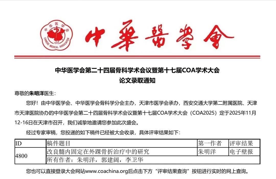 该技术的相关研究已获得2025年河南省医学科技攻关立项,并入选 2025年中华医学会骨科年会电子壁报展示。
