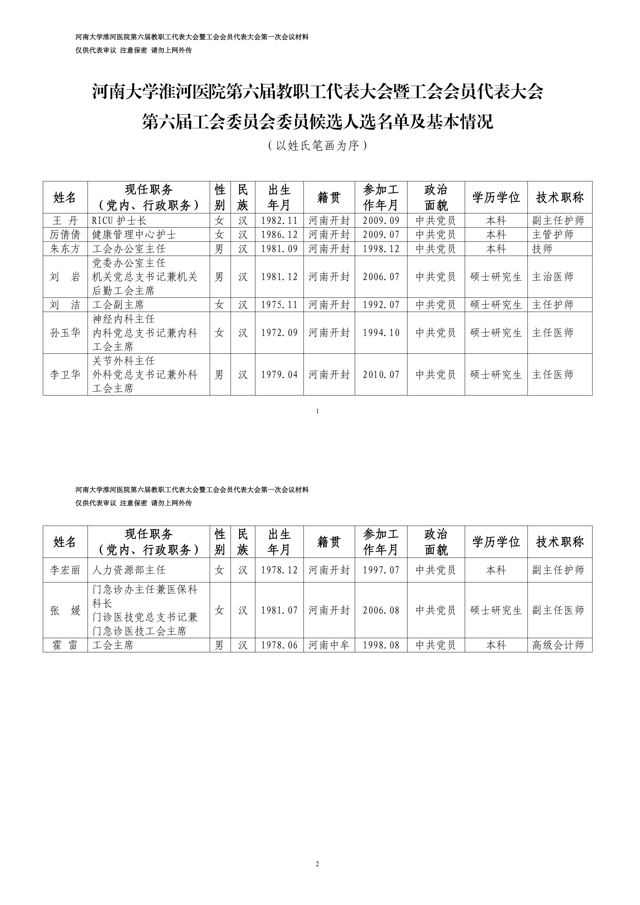 (10)工会委员会委员候选人名单及基本情况